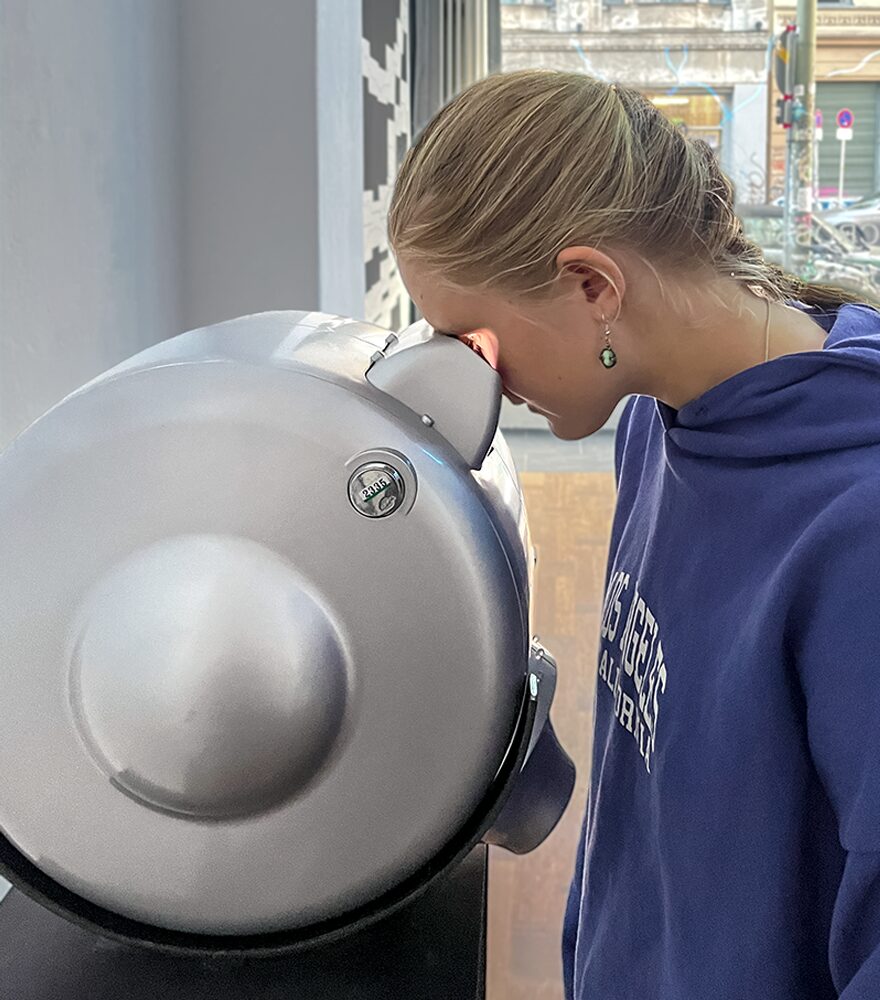 CROSSLIGHT, 2023: photo collage (100 x 100 cm), stereoscope with 10 spatial image montages, series GLOCAL SCENERIES #5b